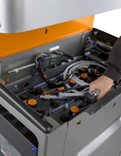 La pantalla en color integrada, ubicada estratégicamente, ofrece al operario toda la información esencial: estado de la batería, tiempo restante de funcionamiento y programa de marcha activo, que además se puede cambiar cómodamente con solo pulsar un botón.