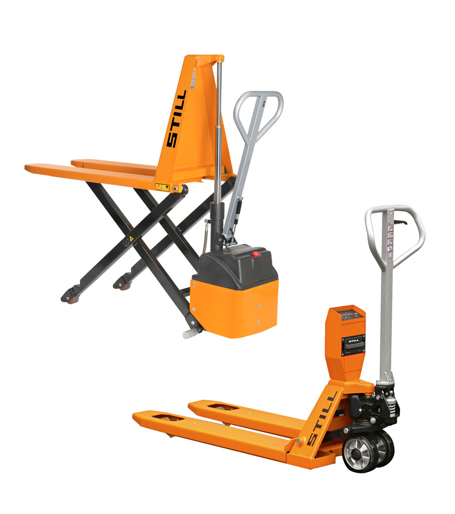 También disponemos de las transpaletas de pantógrafo STILL HPT 10 XM (manual) y HPT 10 XE (electrohidráulica), que permiten trabajar a una altura ergonómica, reduciendo el esfuerzo físico y mejorando la productividad.